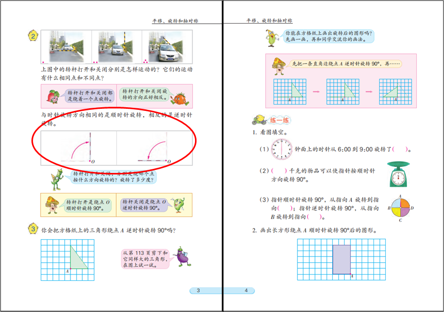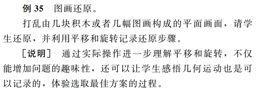 ○通过观察、操作等,在方格纸上认识图形的平移与旋转,能在方格纸上按水平或垂直方向将简单图形平移,会在方格纸上将简单图形旋转90°(参见例35)。