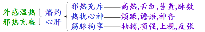 热极生风 | 抽搐,项强 上视,反张 | 高热,神昏 舌红,脉数 | 实热证候 |