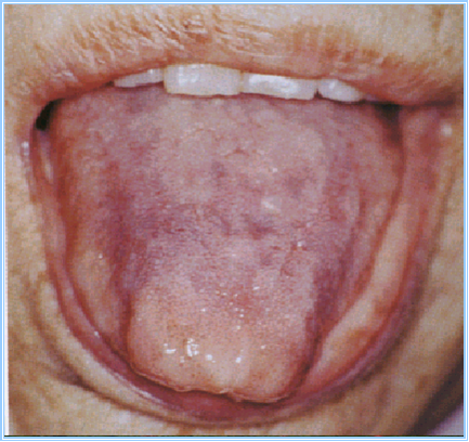 | 舌下细小络脉呈暗红色或紫色网状 |