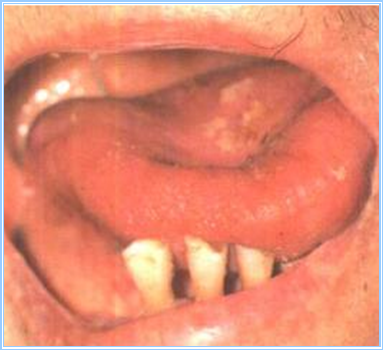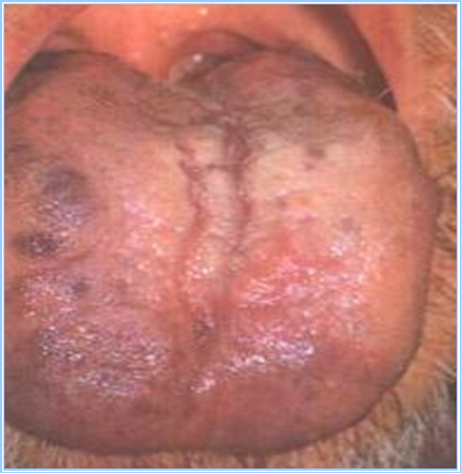 | 舌下络脉曲张如紫色珠子状大小不等的瘀血结节 |
