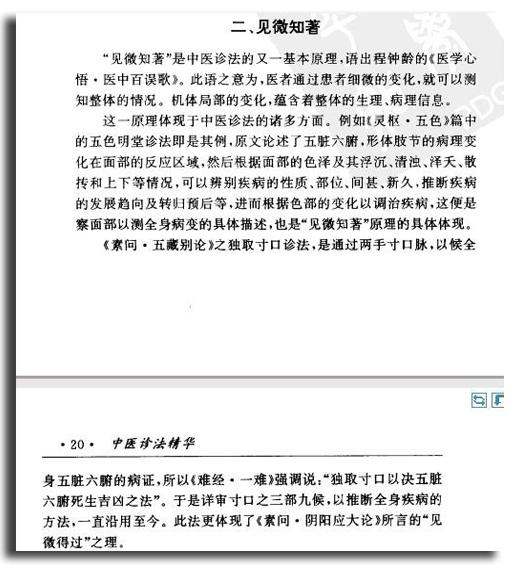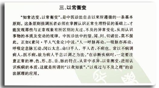 《素问·阴阳应象大论》曰:“以我知彼,以表知里,以观过与不及之理,见微得过,用之不殆。”就是说在认识事物时,应当采取知己知彼,从外测内,观察事物表现的太过或不及,通过微小的改变看出反常的所在,从而认识事物的本质。这便是中医学诊断病证的基本原理。