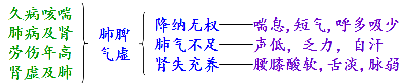 4.要点:短气喘息,呼多吸少 + 肺肾气虚(声低,自汗,腰膝软酸)