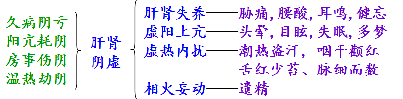 肝肾阴虚证 | 肝肾阴亏 虚热内扰 | 阴虚为主,故多五心烦热,盗 汗颧红,口咽干,健忘,胁痛 |