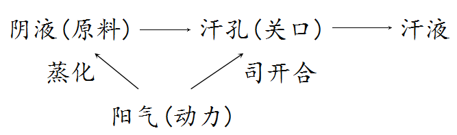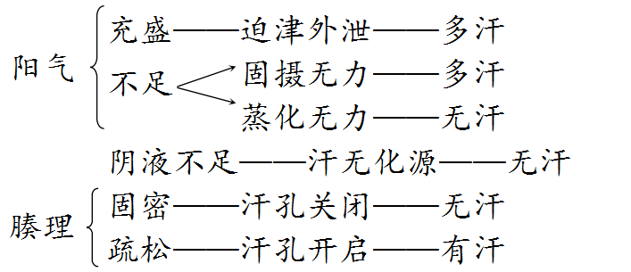 ①汗是体内阴津转化而来,阳气蒸化津液,从腠理达于体表而成。