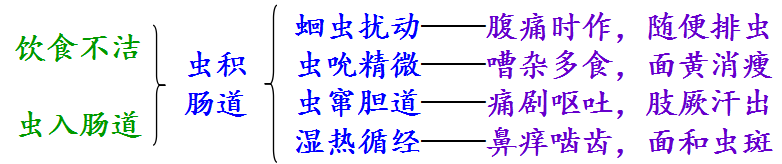 3.要点:腹痛时作 + 随便排虫 + 面黄消瘦