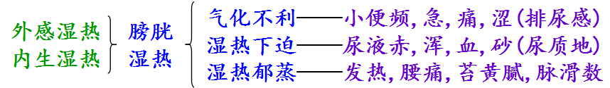 膀胱湿热 | 湿热 | 膀胱 | 发热、苔黄腻 腰痛、脉滑数 | 感受湿热 蕴结膀胱 |