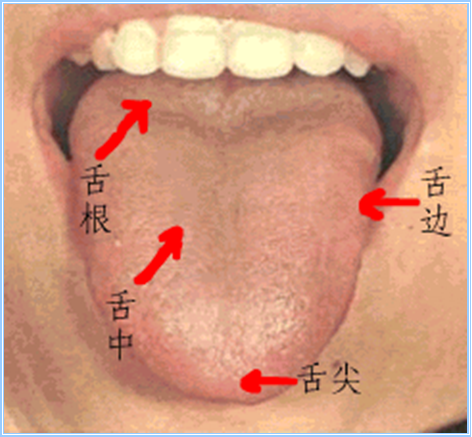 据历代医书记载,脏腑的病变反映于舌面,有一定的分布规律:舌尖应心肺,舌中应脾胃,舌根应肾,舌边应肝胆。