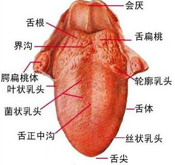 舌为肌性器官,舌质主要由肌肉和丰富的血管、神经组成,舌体前五分之一称为舌尖,舌体中五分之二称为舌中,舌体后五分之二称为舌根,两侧称为舌边。