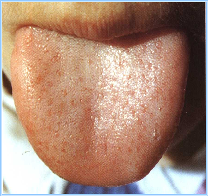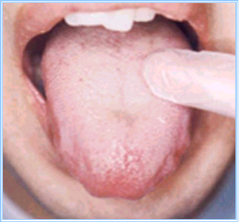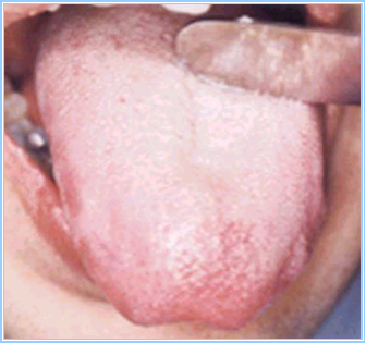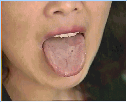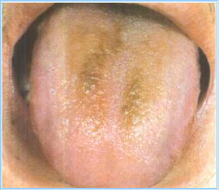 | 染苔苔色不均匀; 可以经漱口去除; 可以通过问诊了解饮食情况加以判断。 苔色与病情不符。 本图为中药染苔。