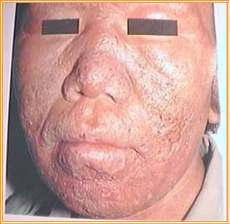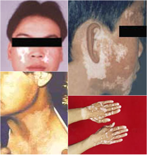 皮肤白斑:大小不等,边界清楚,病程缓慢。