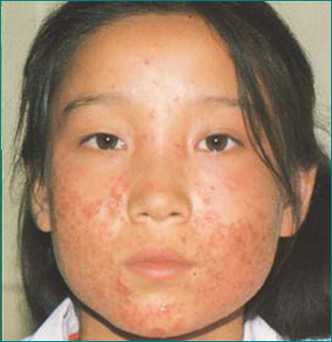 风疹:疹色淡红,细小稀疏,皮肤搔痒,症状轻微——外感风邪。
