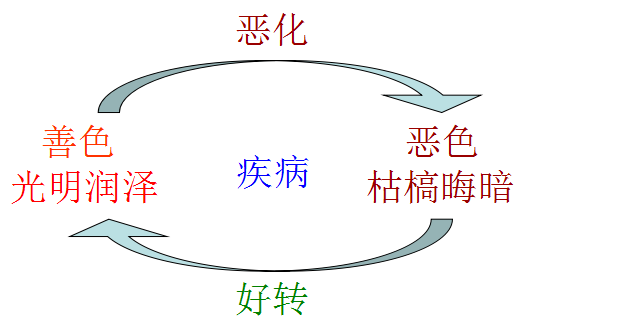常色与病色:常色是指人身体健康时所表现出的正常面色,健康人的常色一般为光亮润泽,且隐于皮肤下面,并不特别外露。常色一般又分为主色和客色。病色,是指人身体发生病变的时候所表现出的病态面色。病色一般又可分为善色和恶色。