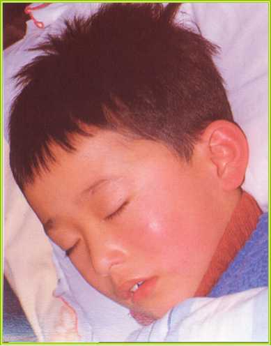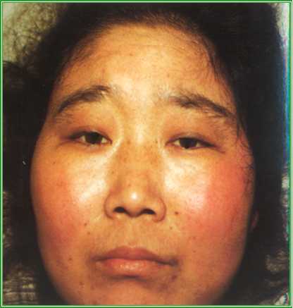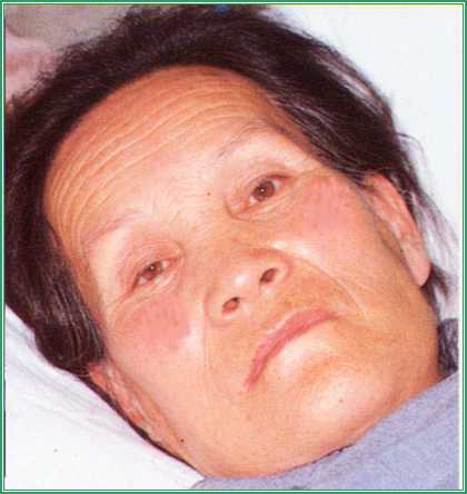 赤色主热证,亦可见于戴阳证。满面通红,里实热证;满面通红,肝阳上亢,气火上逆;颧部潮红,阴虚火旺。常伴五心烦热、午后低热、心烦失眠。本图为浸润型肺结核(肺痨),于每天下午潮红、低热,伴干咳等证。