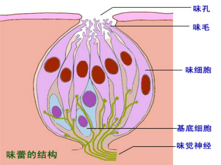 味蕾(taste bud)是动物的味觉感受器。味蕾的顶端是味孔,开口在舌头表面。每个味蕾中有50-150个味受体细胞(taste receptor cell)。