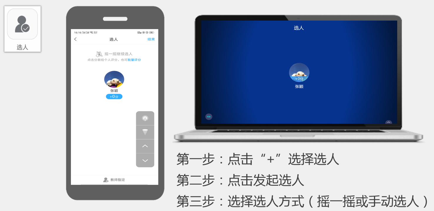 点击活动库里的“选人”,编辑题干,点击右上角“保存”或“发起选人”,可以摇一摇随机选人或者手动选人,对于选中的同学可以进行积分奖励。